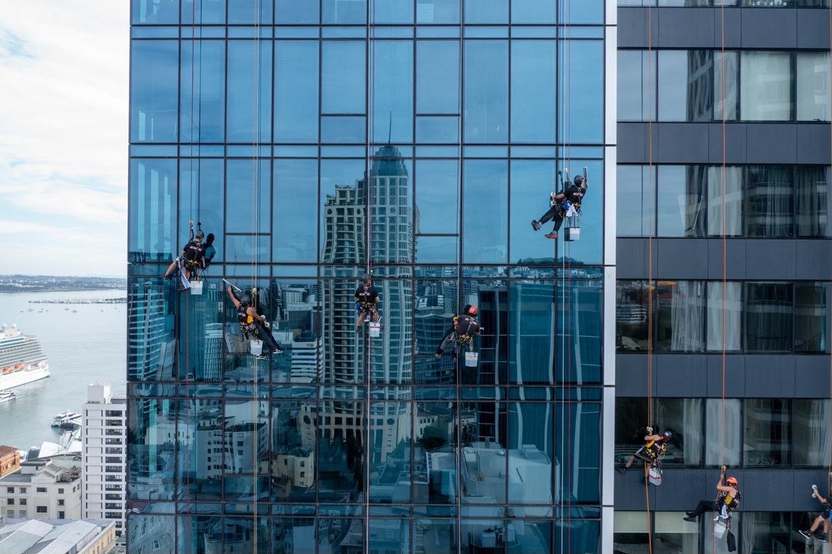 The most productive workers in the city are the abseilers cleaning windows.